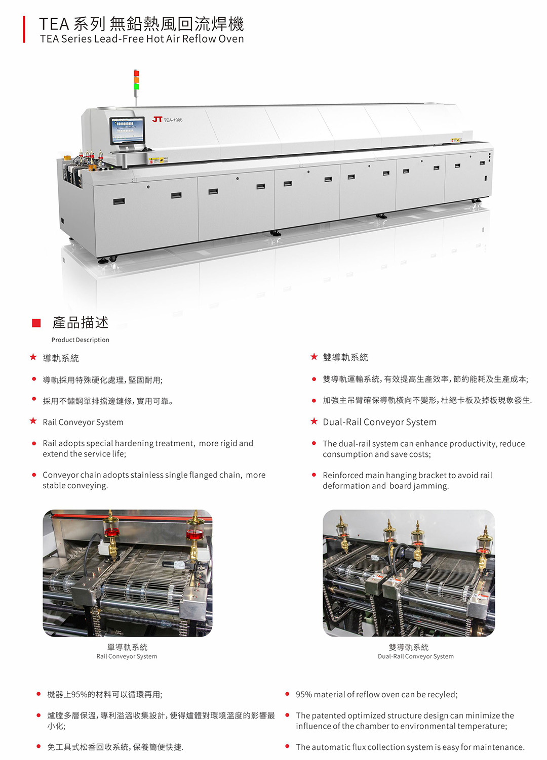 完全滿足各種無鉛焊接工藝要求。Windows7 操作系統(tǒng),中英文界面,操作簡單易學。標準上8下8空氣爐,專利熱風管理系統(tǒng)使熱風對流傳導更高效熱捕捉更快。PLC十PID閉環(huán)控制,性能穩(wěn)定可靠,溫度控制及曲線重復精度高。雙溫度傳感器,雙安全控制模式,速度異常報警,掉板報警。全模塊化設計,維護保養(yǎng)方便快捷,減少維護時間及成本…
